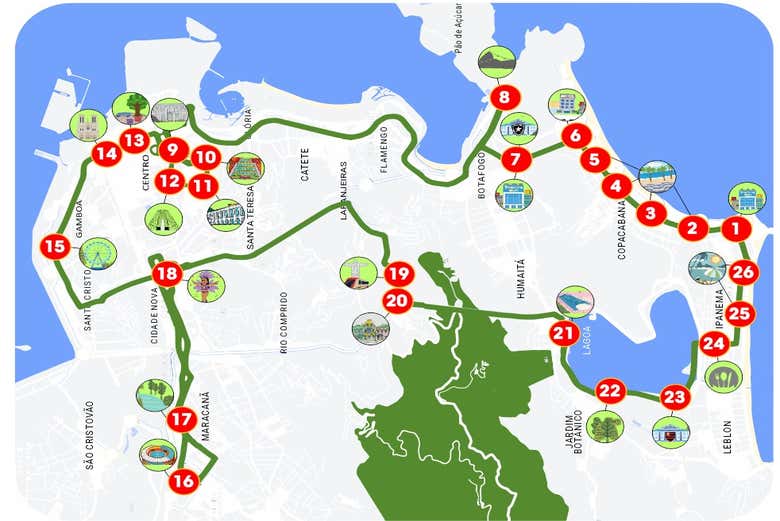 Una vez que usen su pasaje para el colectivo turístico de Río por primera vez, van a poder usarlo durante 1 día. Las paradas donde van a poder subir son las siguientes:
